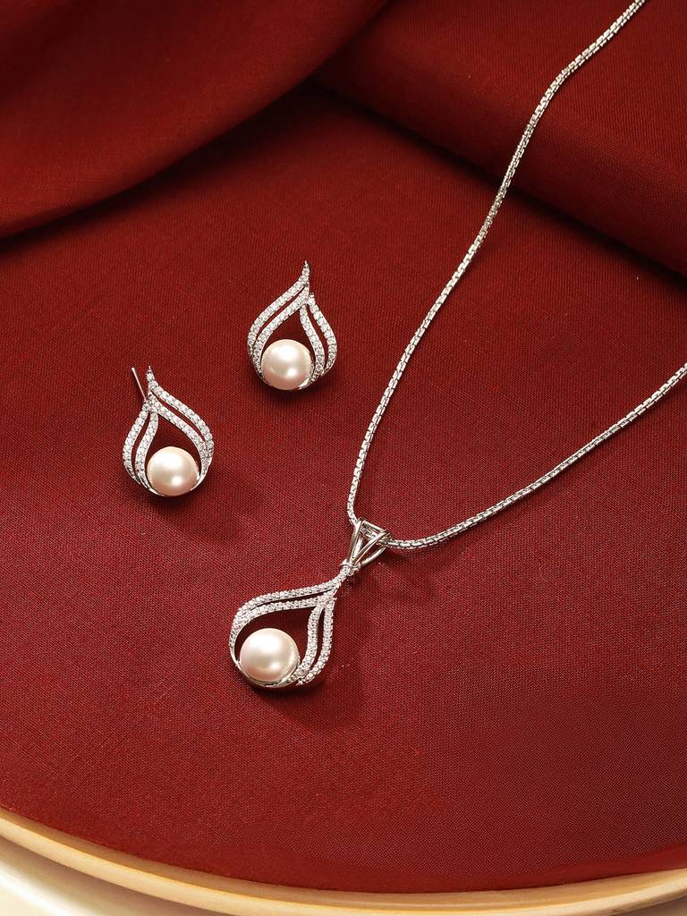 Saraf RS JewellerySilver Plated Ad & Pearl Beaded Minimal Delicate Pendant With Chain Jewellery Set