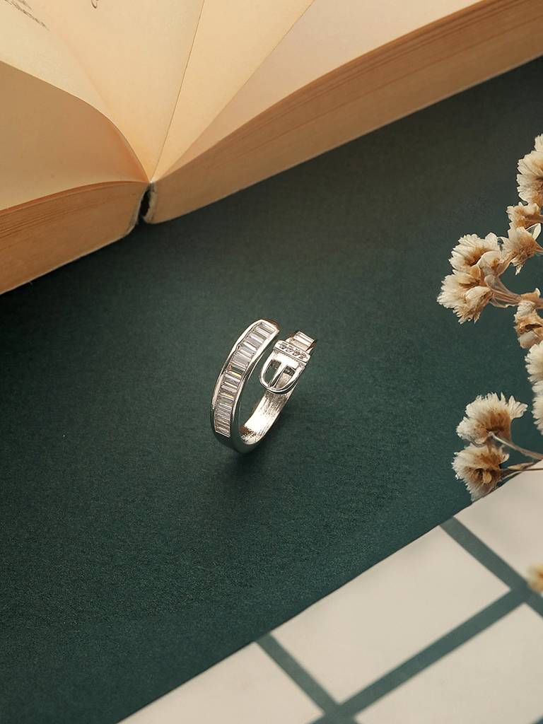 Saraf RS JewellerySilver Plated Buckle Design Cz Studded Minimal Band Finger Ring