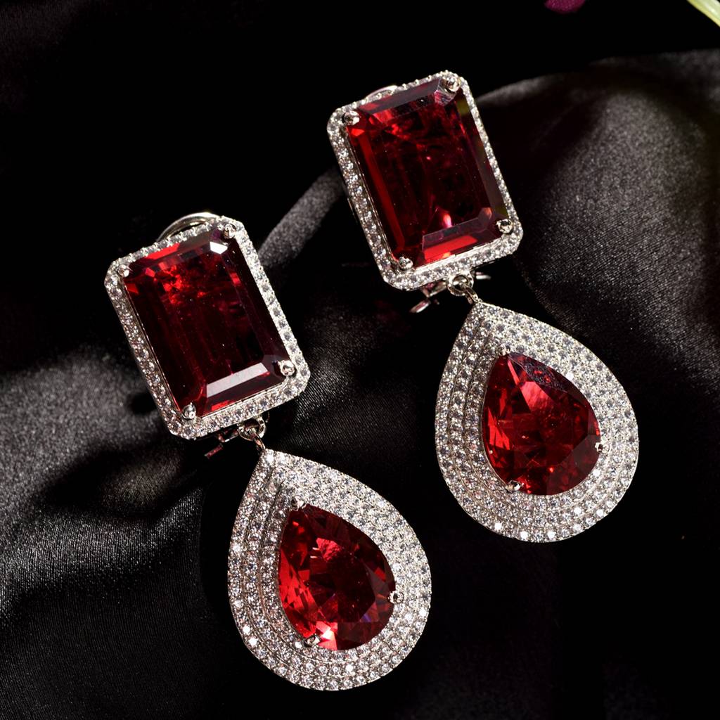 Silver Plated Red Ruby Studded Teardrop Chandelier Earring : SJER1330