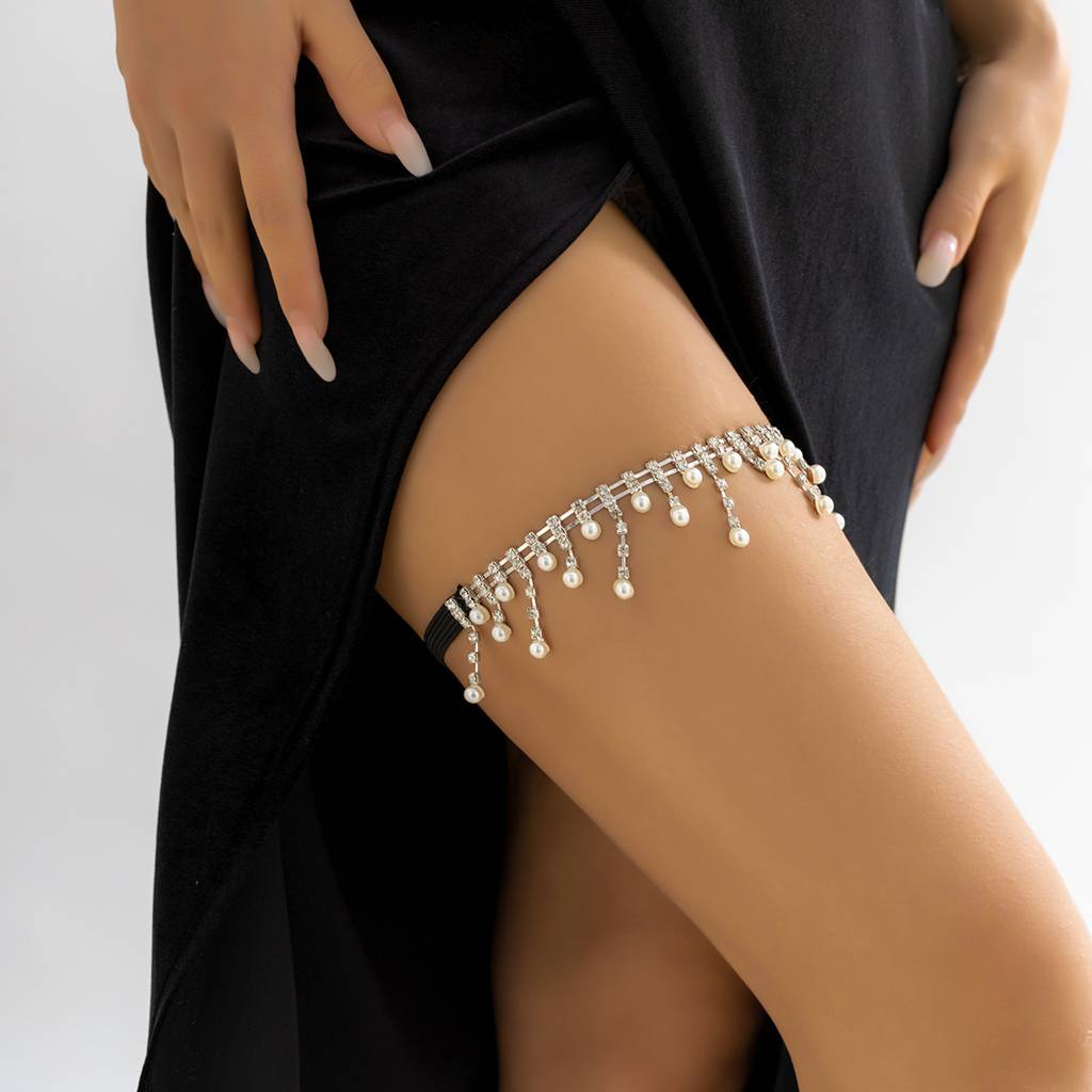 Silver Plated Thigh Chain With Faux Pearls And Rhinestones : ASX1224BJ188S