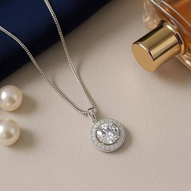 MysticSilver-Tone Halo Pendant Necklace With Round Crystal Charm For Women Daily Wear