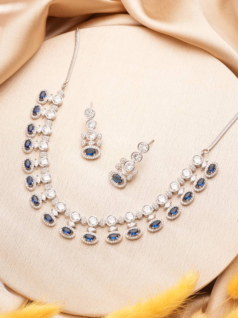 Saraf RS JewellerySilver Toned Sapphire Blue Ad Studded Statement Delicate Necklace Jewellery Set