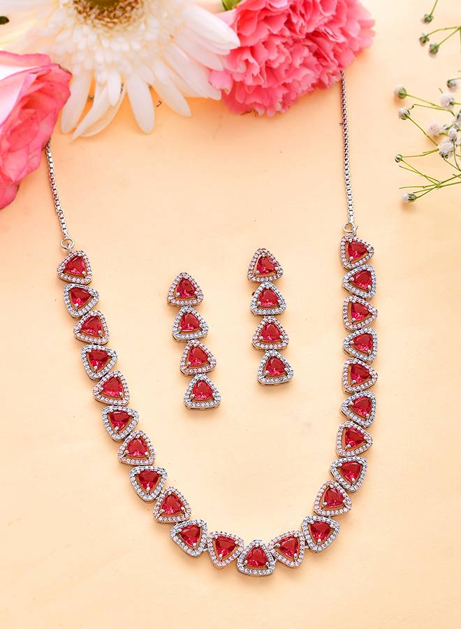VoyllaSparkling Elegance Red And White Triangle Cut Cz Jewellery Set (One Size)