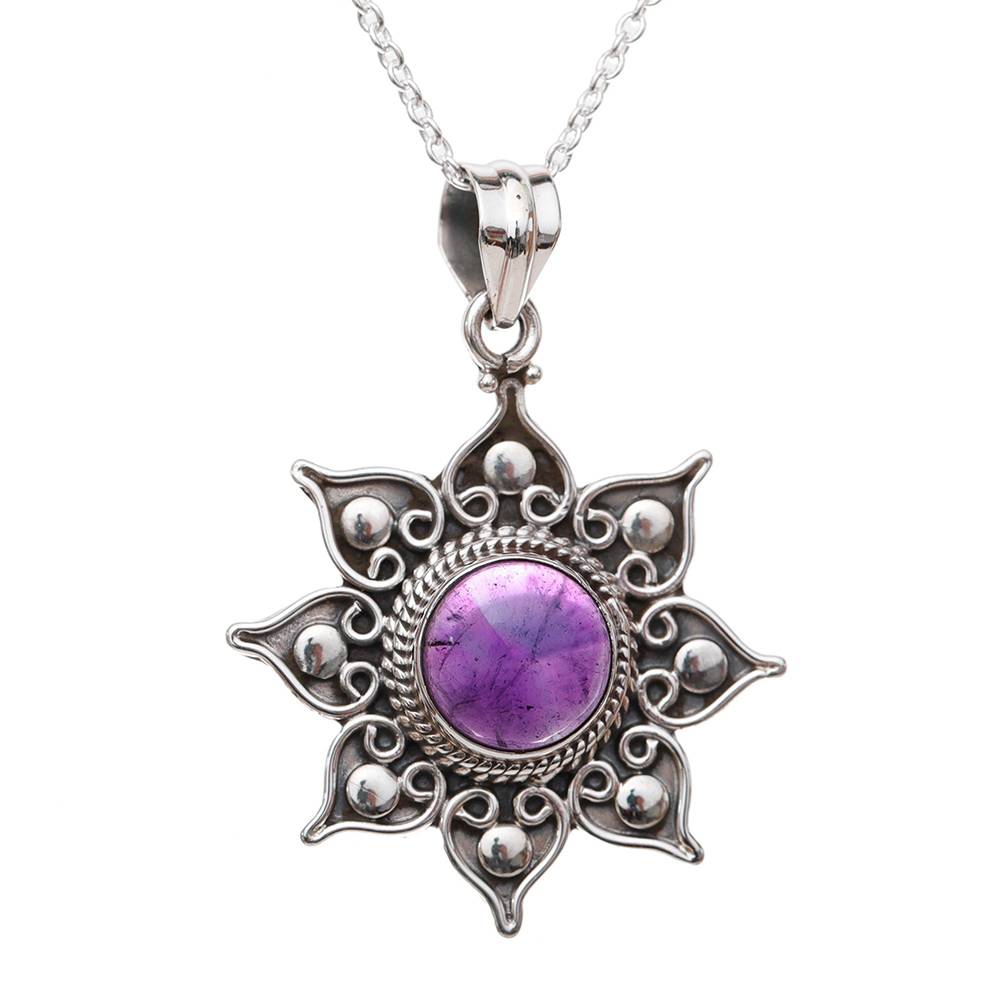 Sterling Silver Pendant With Flower Round Cut Gemstone : JUZ55--amethyst