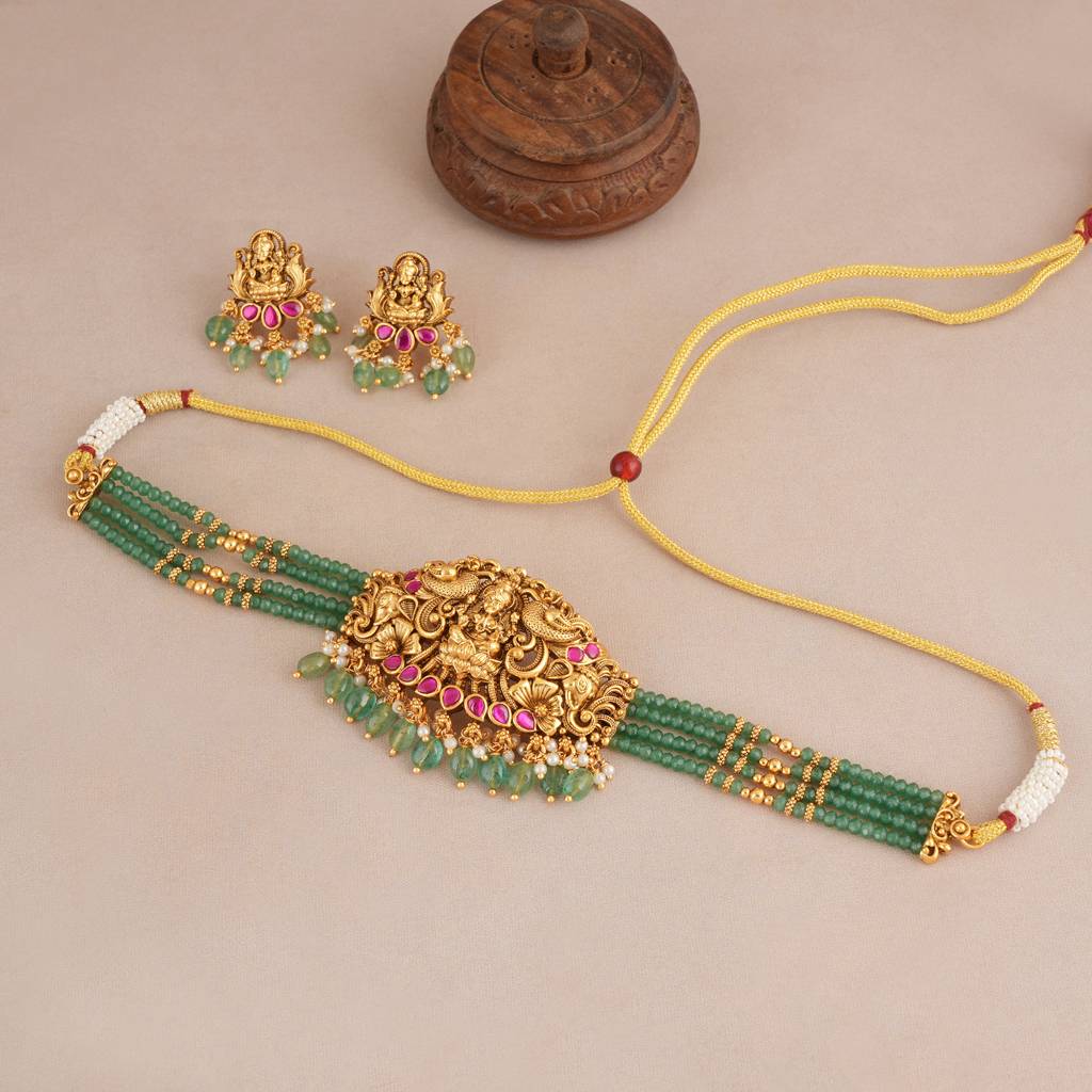 Smars JewelryStunning Maa Lakshmi Antique Gold Muticolor Choker Set I Temple Jewellery
