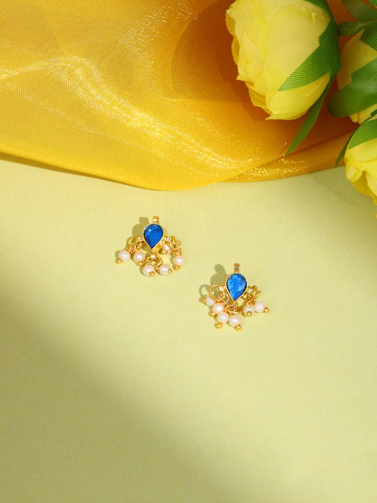 Ruby RaangTear Drop Shaped Kundan Studs Earrings In Blue Stone With Pearl Jhallar In Gold Plated Brass (One Size)