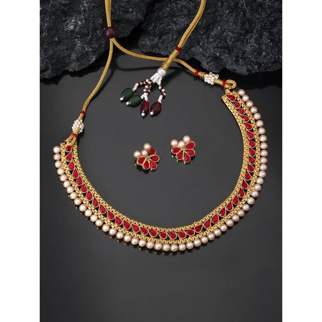 Traditional Gold Plated Studded Choker Necklace Jewellery Set For Women-Pf04N3390 : PF04N3390R