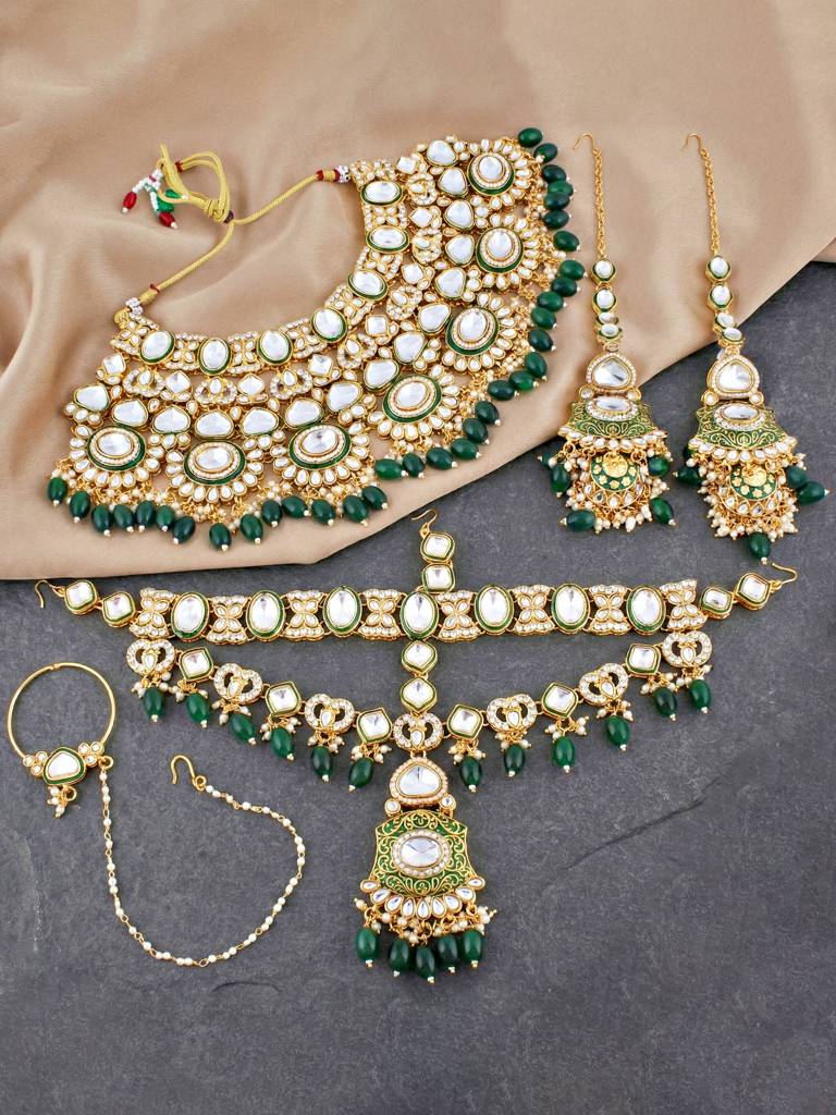 LUCKY JEWELLERYTraditional Kundan White Stone Jewellery Set For Women | Green Meenakari Gold Plated Ethnic Necklace Set With Jhumka Earrings, Mathapatti With Sheesh Patti & Nath (4125-Izr-2414-G) (12 Inches)