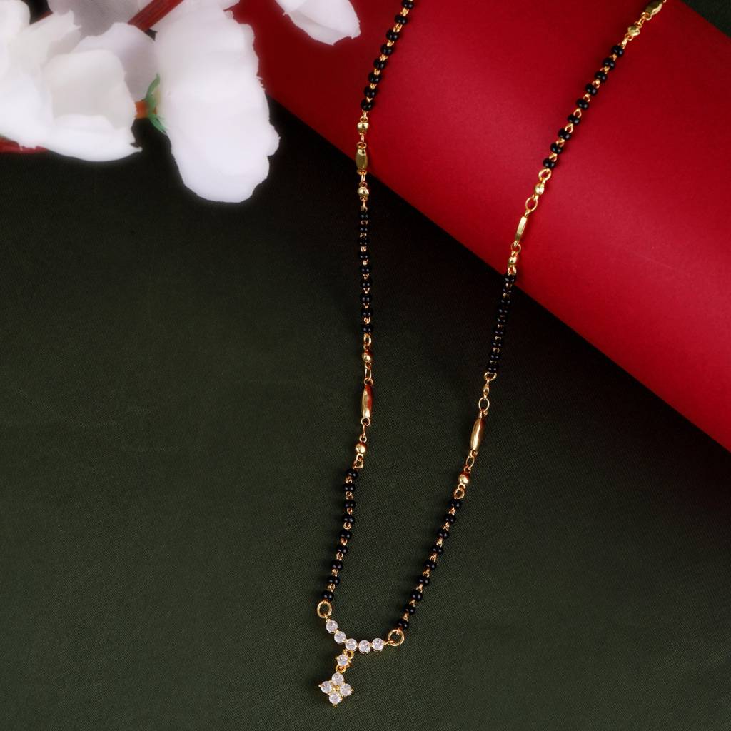 Traditional Lovely Cz Studded Flower Design Gold Plated Black Beaded Adjustable Chain Mangalsutra For Women : 15MS107