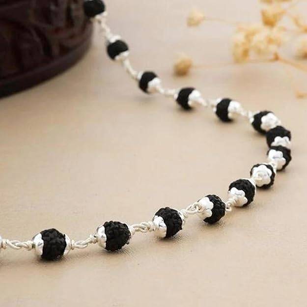 MysticTrendy Black Rudraksha Beads Mala With Silver Finish Caps For Devotional & Festive Wear
