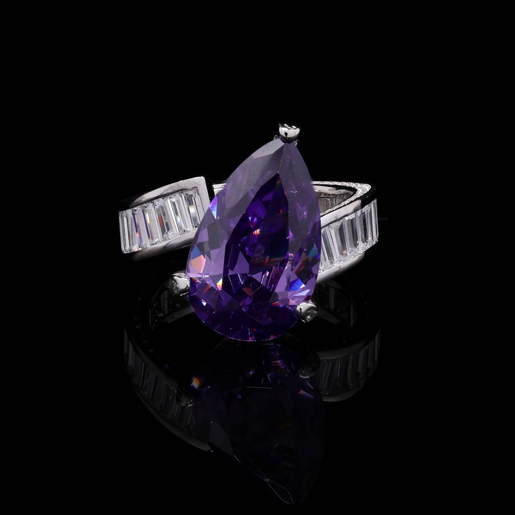 Ultra Premium 1.25 Carat Drop Amethyst Signature Ring With American Diamond Baguettes On Pure 925 Silver : TR3268