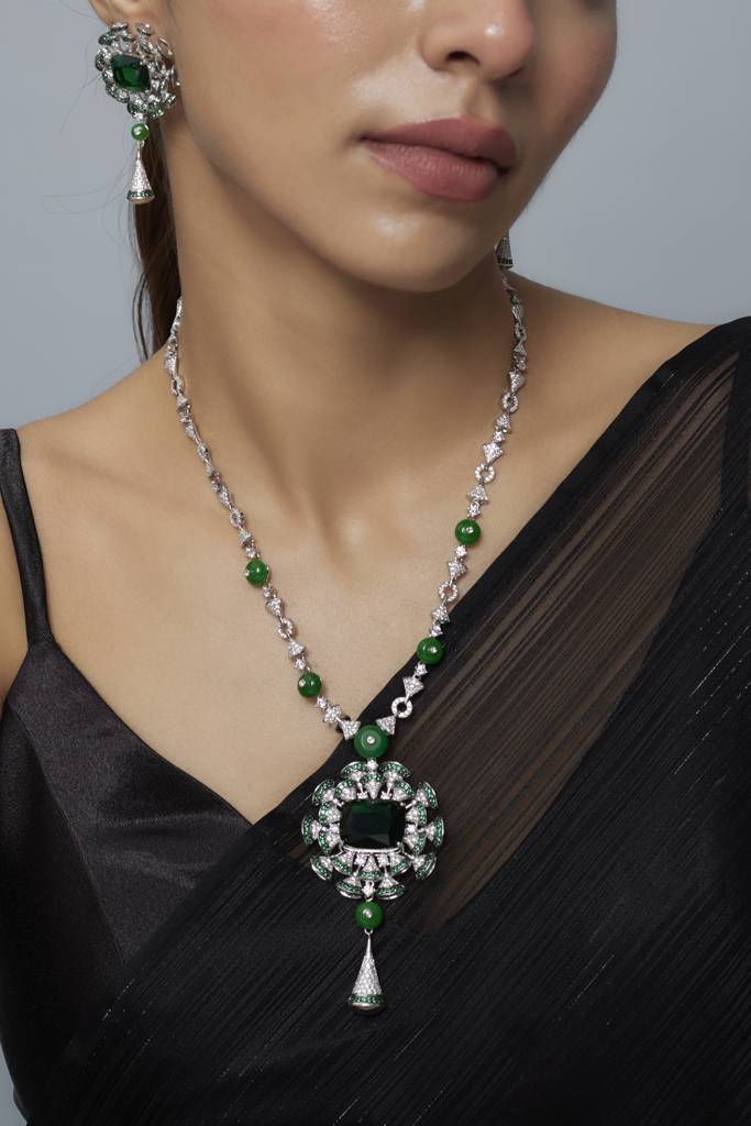 Vivinia By Vidhi Mehra Zia Silver Plated Green Womens Zircon Long Necklace Set With Pair Of Earrings -Vn814 : VN814
